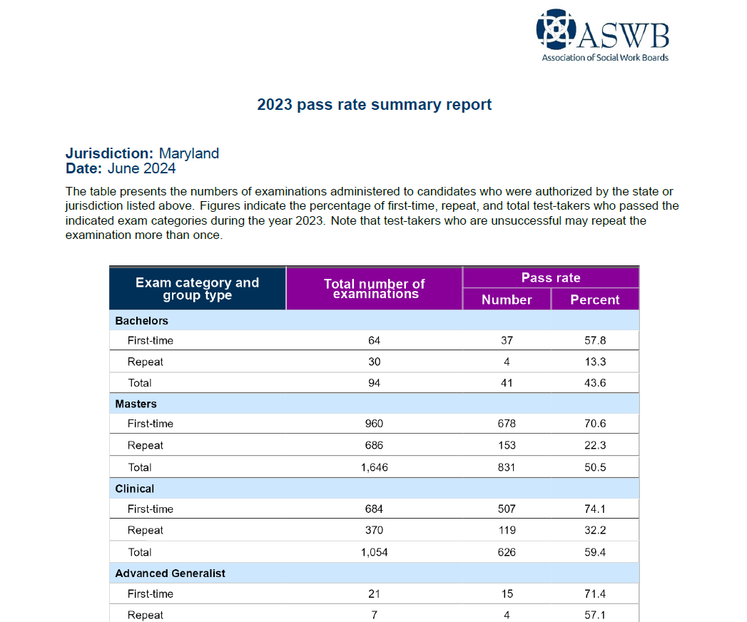 While the data you provided offer specific Maryland numbers, I will also supplement with broader ASWB pass‐rate trends (when state-level data are sparse) to frame context.